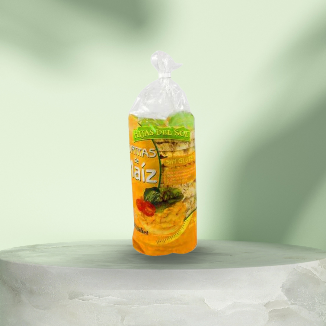 Las tortas de maíz sin gluten Hijas del sol de Ynsadiet son un complemento para desayunos, meriendas y aperitivos contribuyente en dietas de control de peso gracias a su bajo aporte calórico. Son bajas en azúcares, grasas y grasas saturadas, y además aportan fibra.