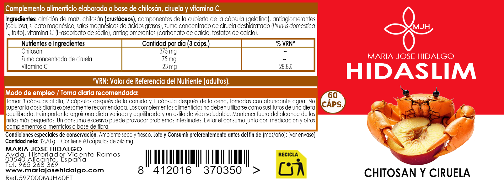 El CHITOSAN María José Hidalgo es un complemento alimenticio elaborado a base de chitosán, ciruela y vitamina C.
