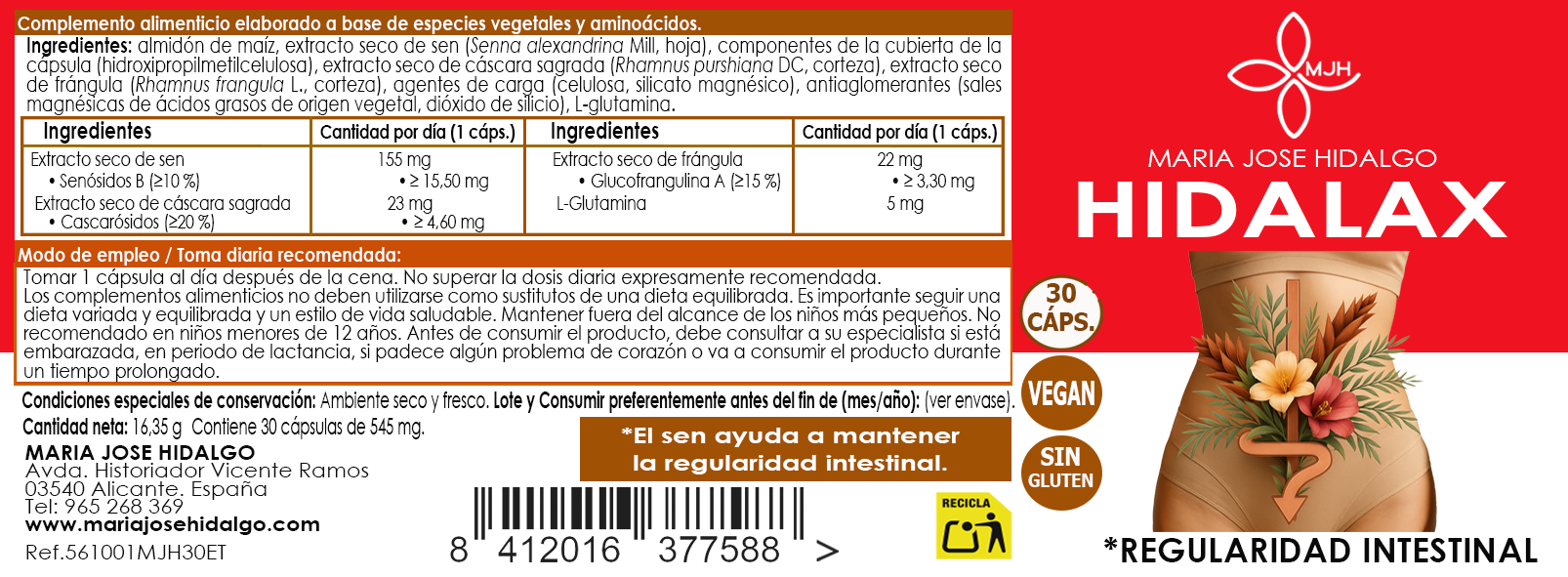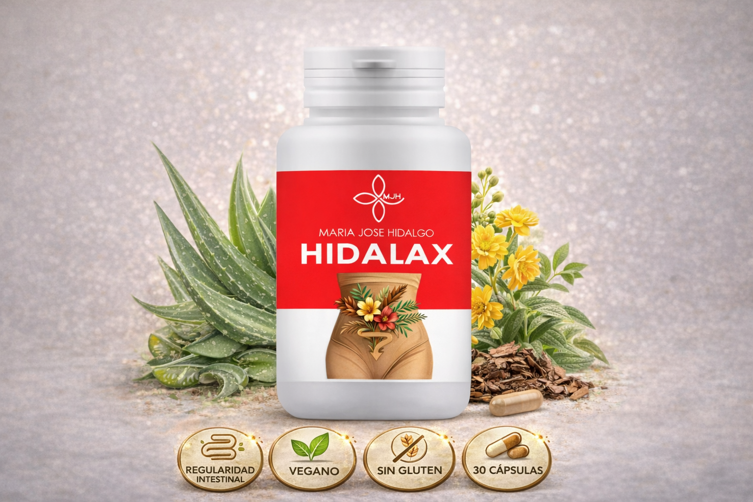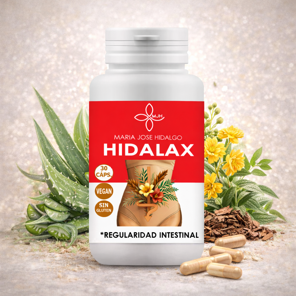 HIDALAX María José Hidalgo es un complemento alimenticio formulado para ayudar a la regularidad intestinal, a base de Sen y Cáscara sagrada, y una combinación de extractos de plantas y aminoácidos: ruibarbo, sales de magnesio, silicio y L-Glutamina.