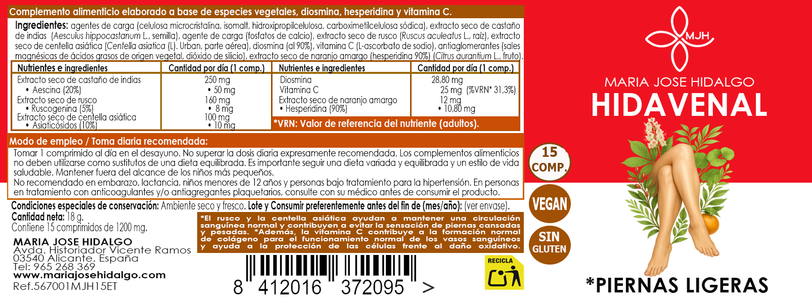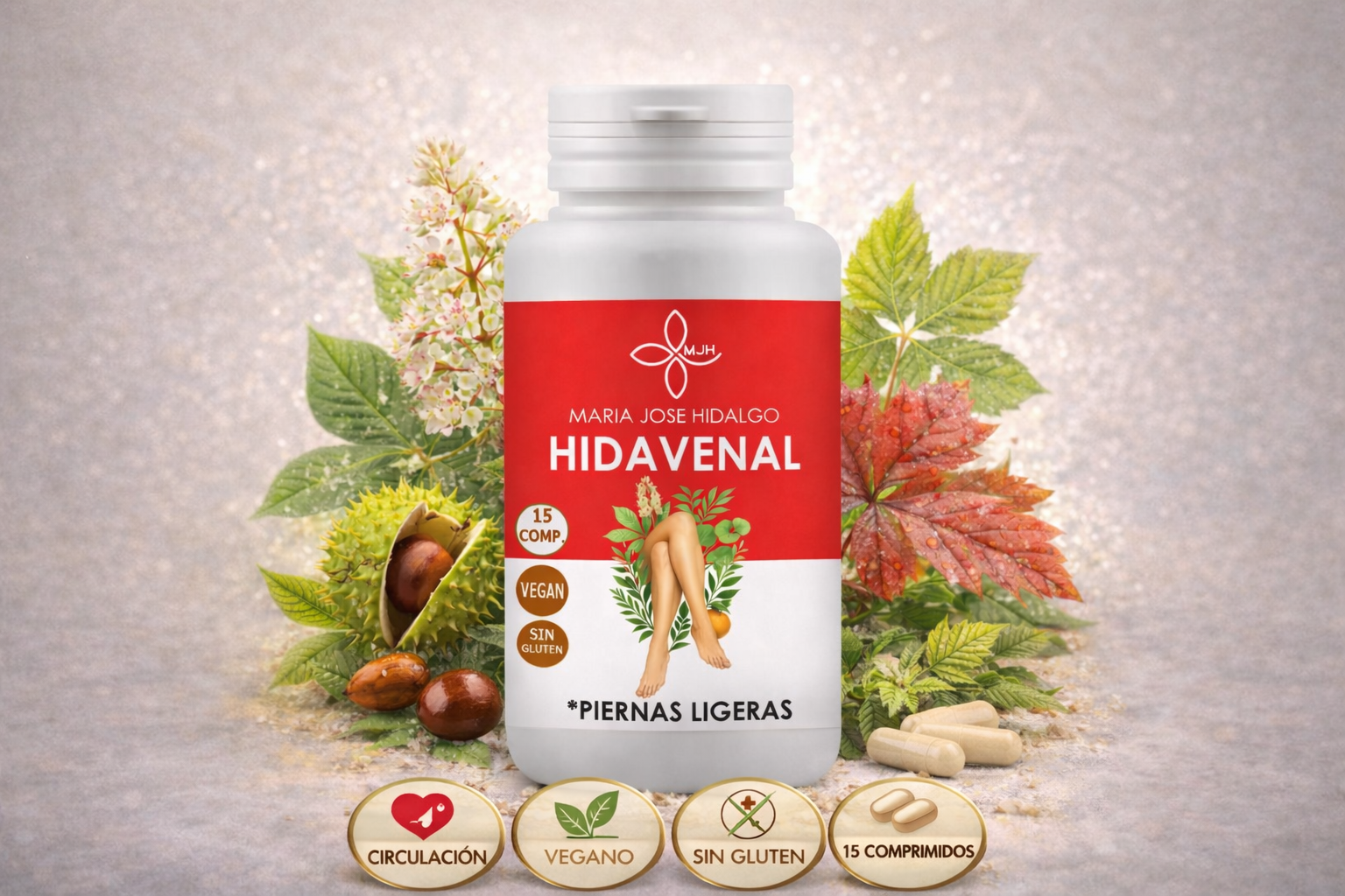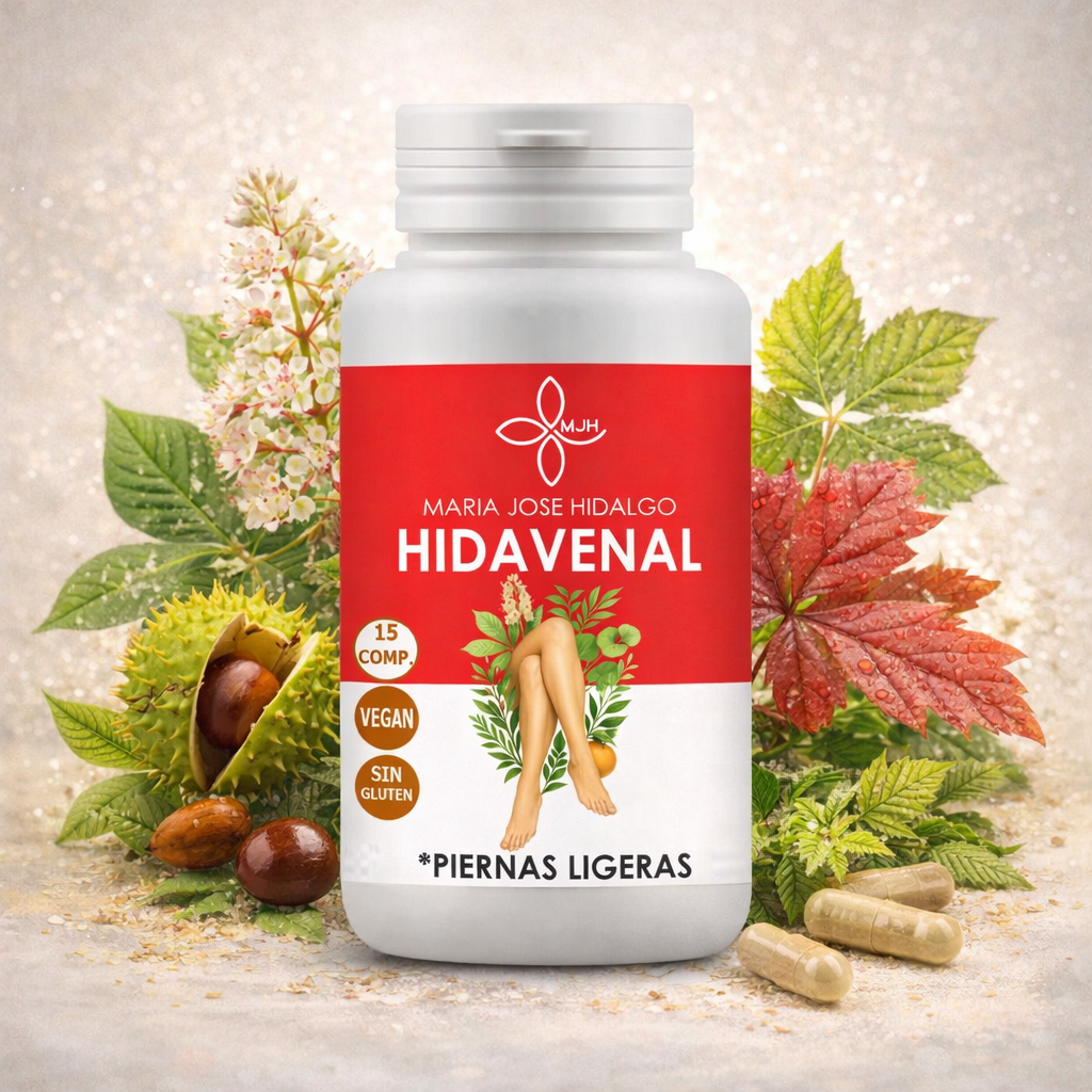 HIDAVENAL de María José Hidalgo es un complemento alimenticio formulado con extractos secos de Castaño de Indias (20% de aescina), Rusco (5% de ruscogenina) y Centella Asiática (10% de asiaticósidos), en combinación con Diosmina, Hesperidina y Vitamina C.